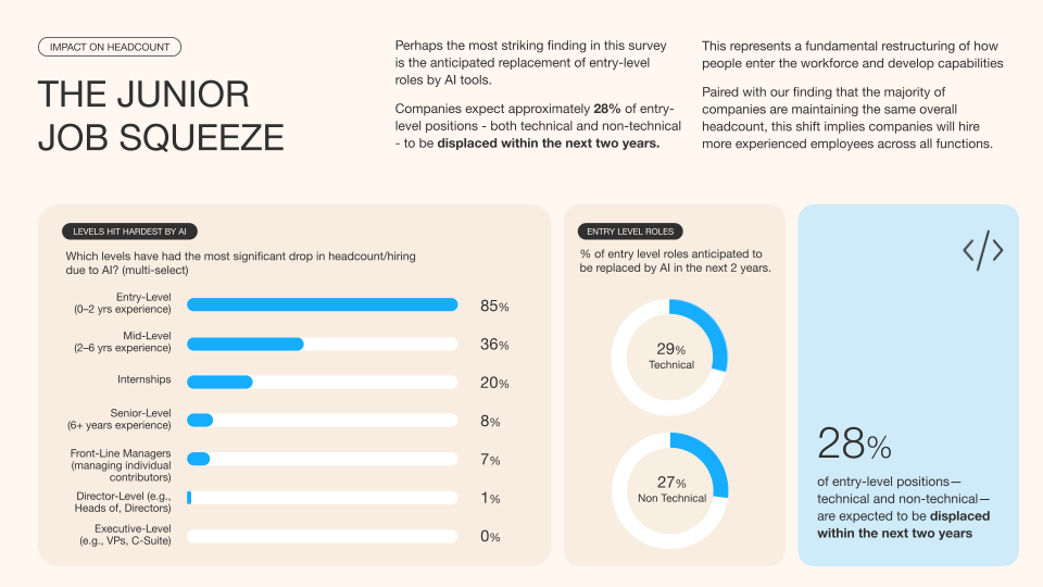 Finding: 28% of entry-level positions (both technical and non-technical) are expected to be displaced by AI within 24 months. Companies will hire more experienced talent across functions.
