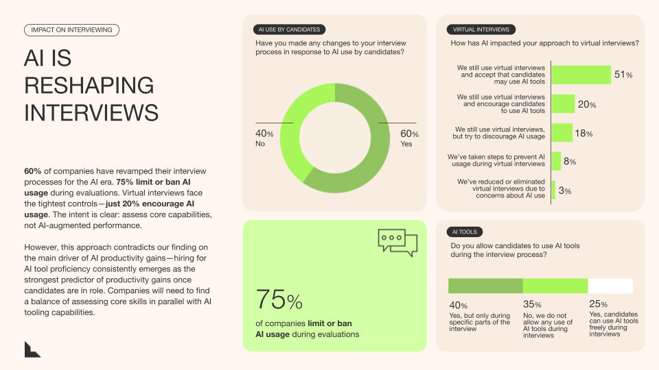 Finding: 60% of companies revamped interviews for the AI era, with 75% limiting or banning AI usage during evaluations. Only 1 in 5 encourage AI in virtual interviews. Yet, AI proficiency is the strongest predictor of productivity.